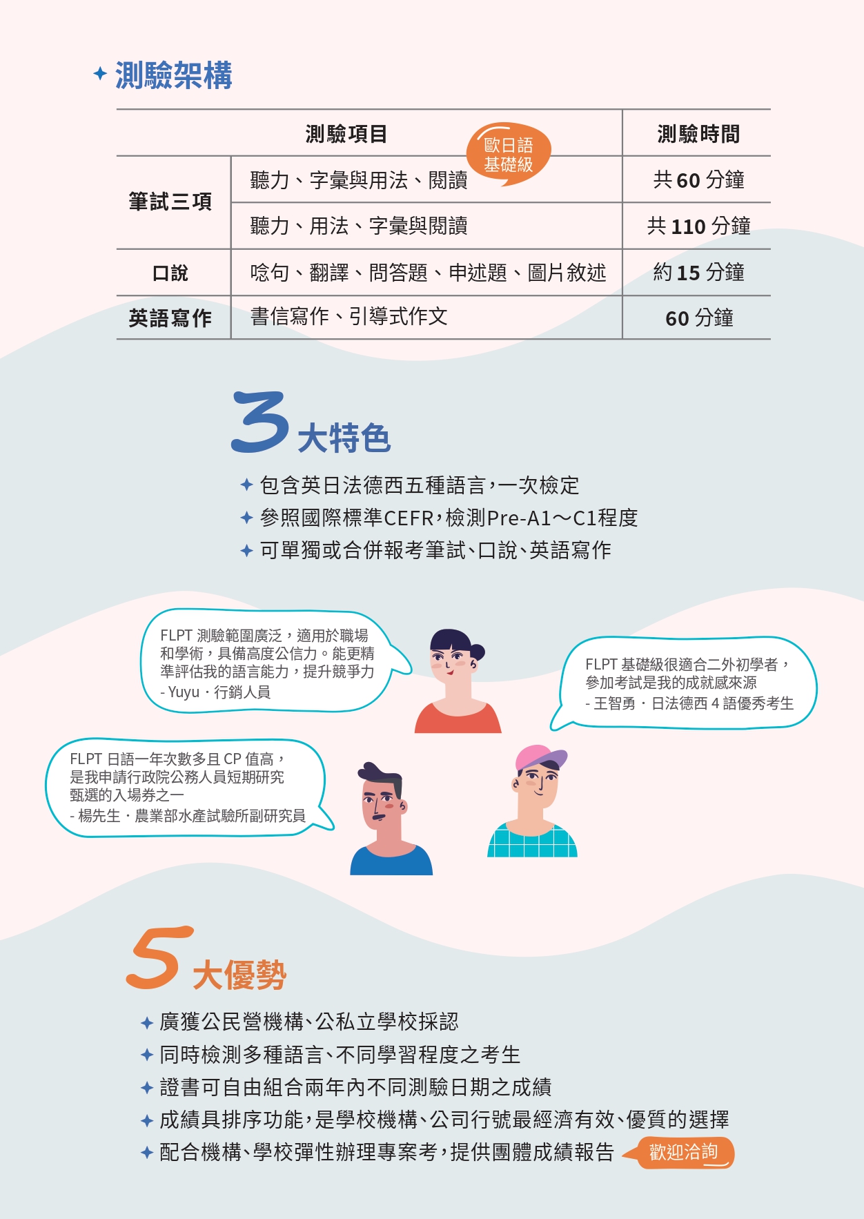 三、 歡迎洽詢模擬試題,團體訂購另有優惠!更多備考與學習資源歡迎瀏覽FLPT官網(https://www.flpt.tw)。